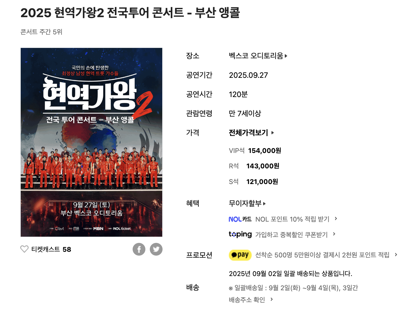 2025년 5월 3일(토) 13시/18시, 벡스코 오디토리움에서 열리는 현역가왕2 부산 콘서트는 좌석 경쟁이 치열할 수 있습니다. 인터파크 오픈 시간(3/17 14:00)에 맞춰 결제수단을 미리 등록하고, 선호 구역을 사전에 결정해 두시면 성공 확률이 올라갑니다.