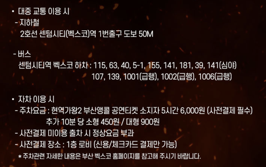 - 주차 요금(사전결제): 공연 티켓 소지자 5시간 5,500원